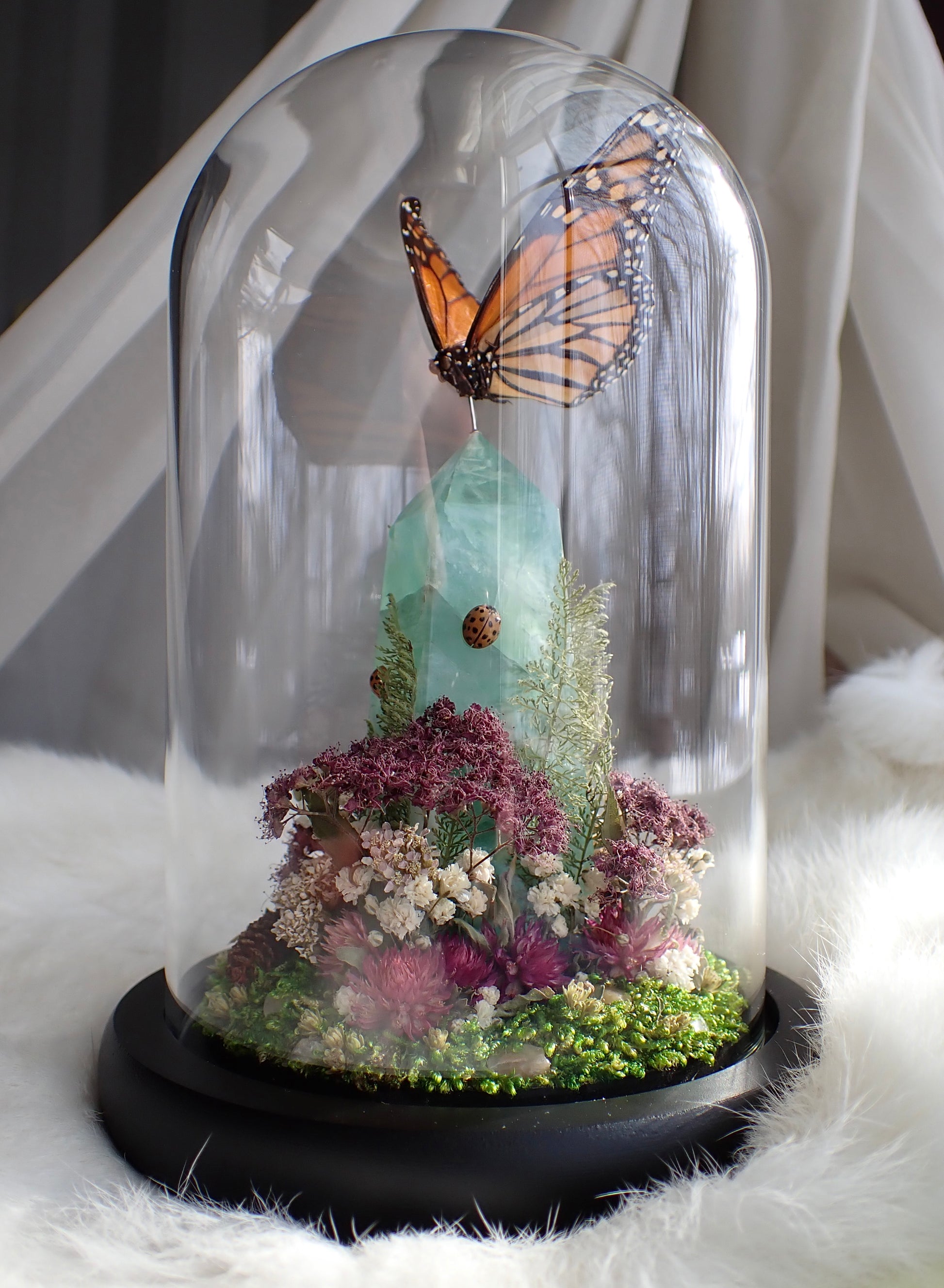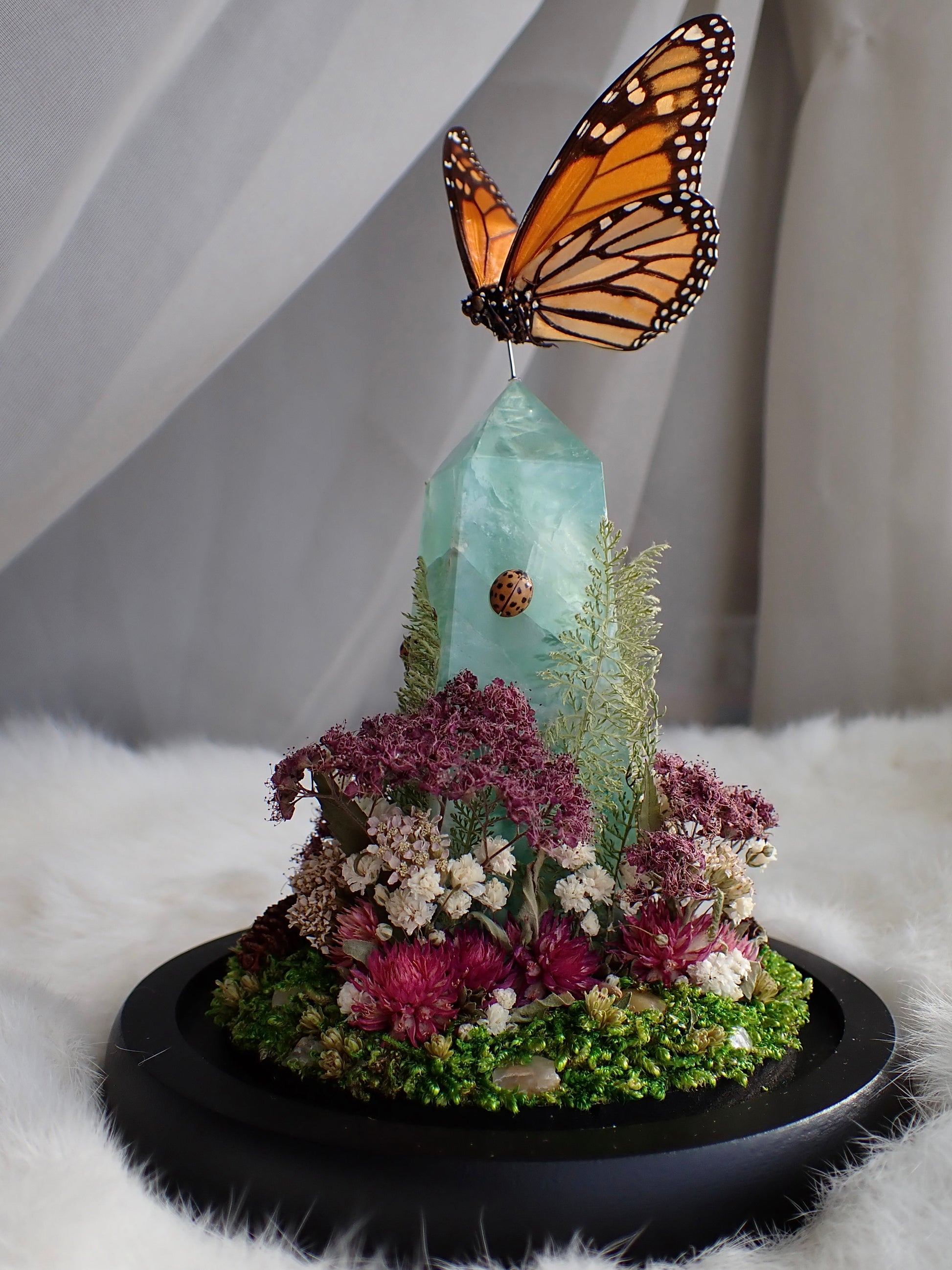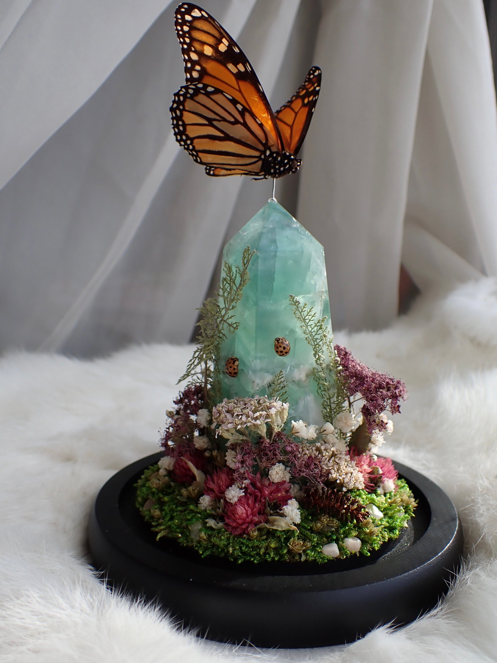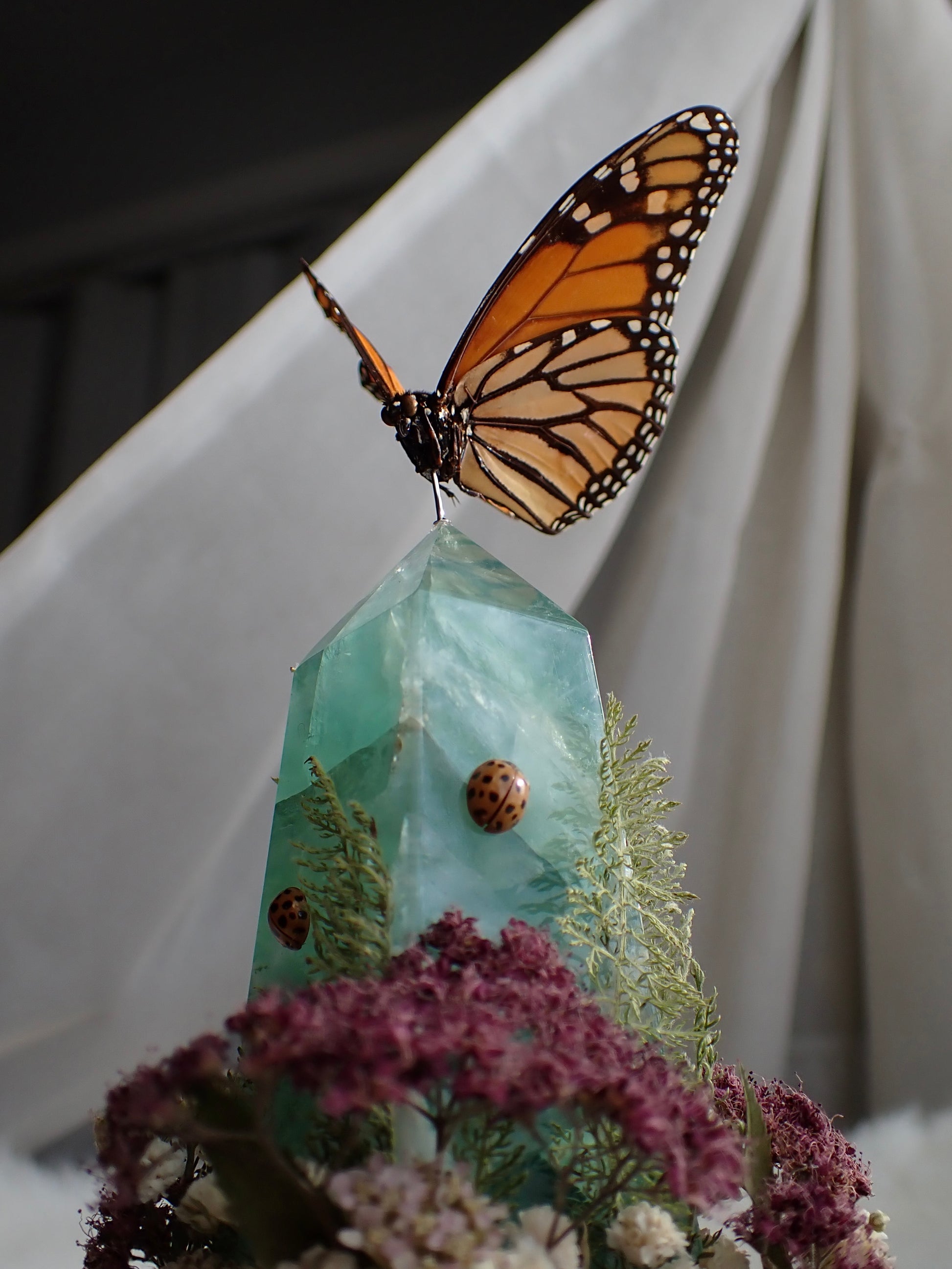 Monarch perched in flight above a fluorite crystal point with a lady beetle on each side. PinkΒ and white flowers and quartz pieces at theΒ base.Β