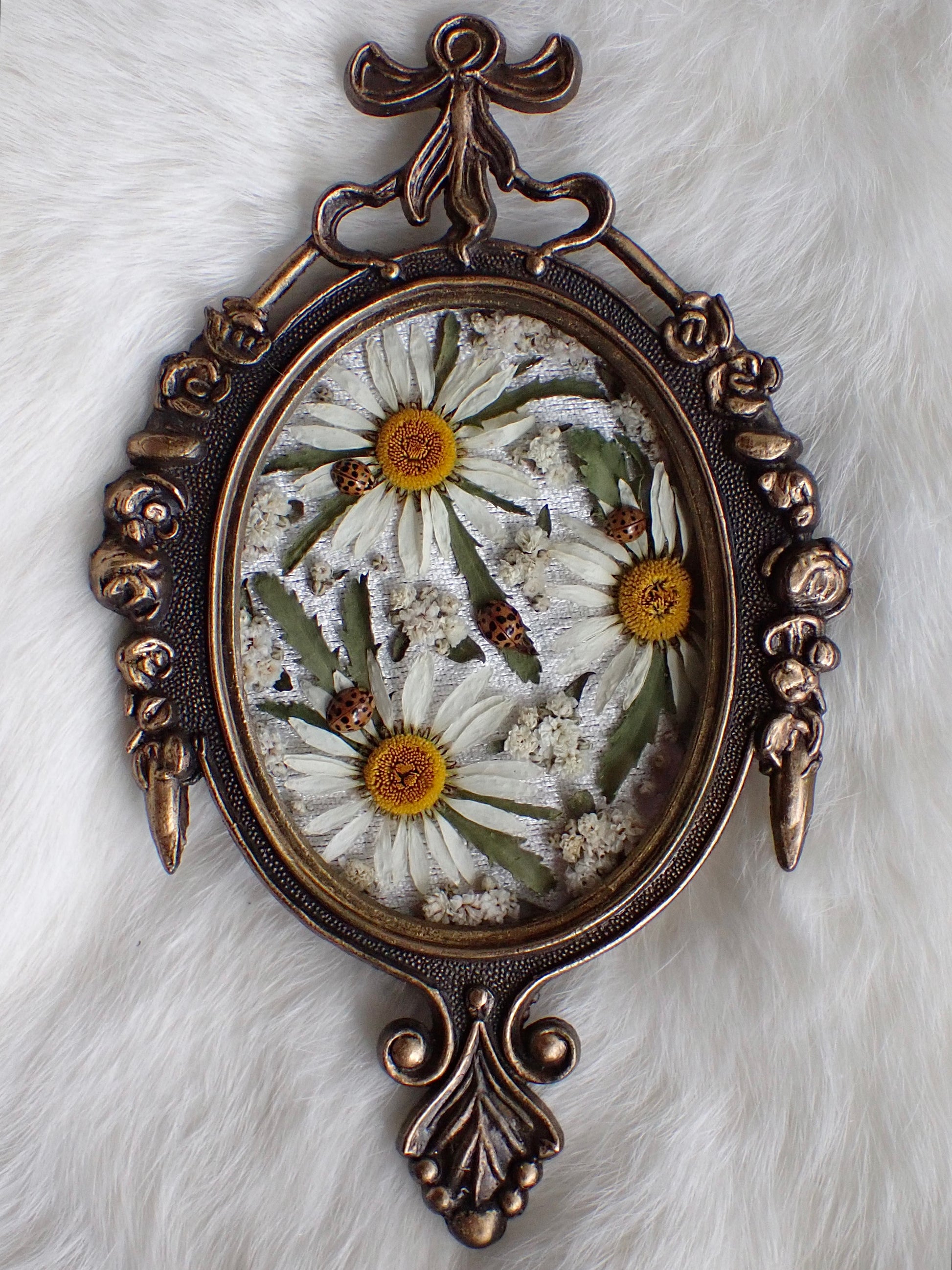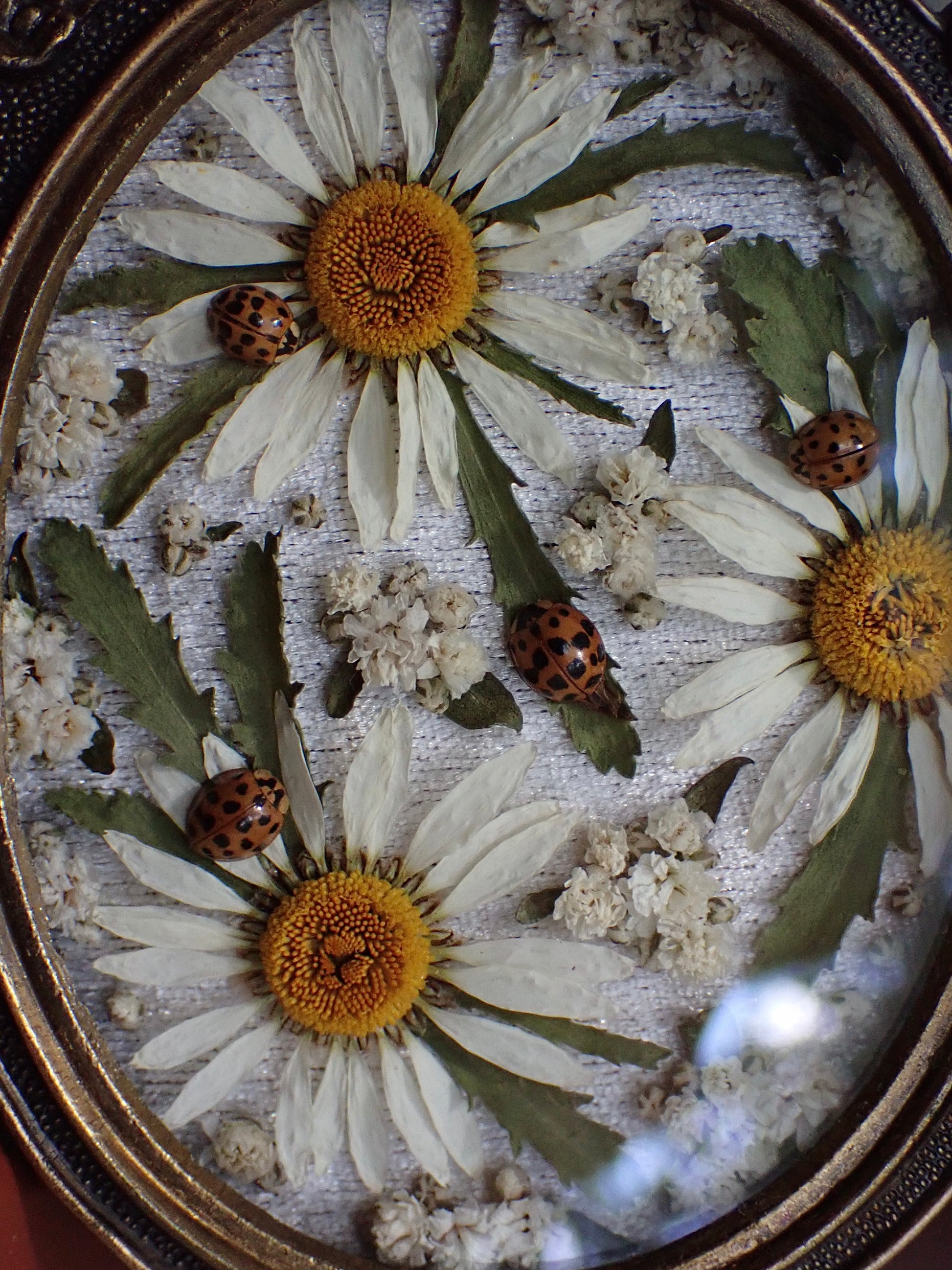 Vintage ornate frame with oxeye daisies, baby’s breath flowers and four lady beetles.